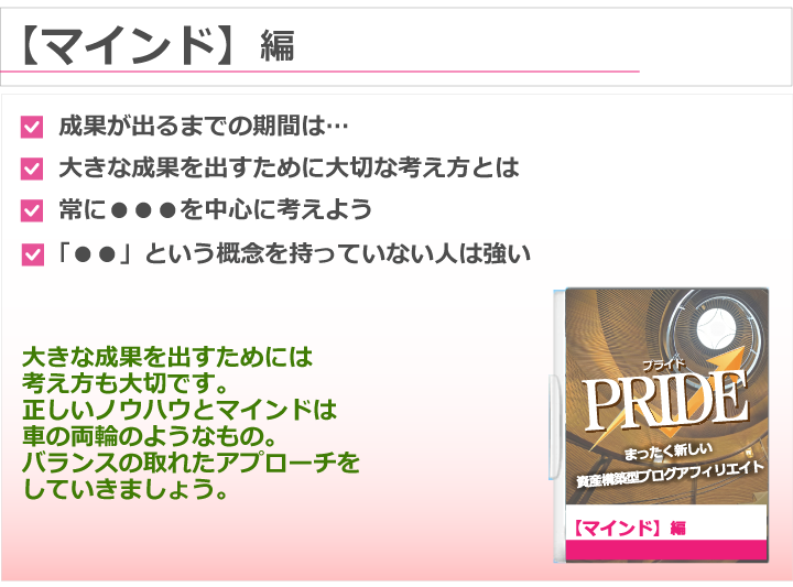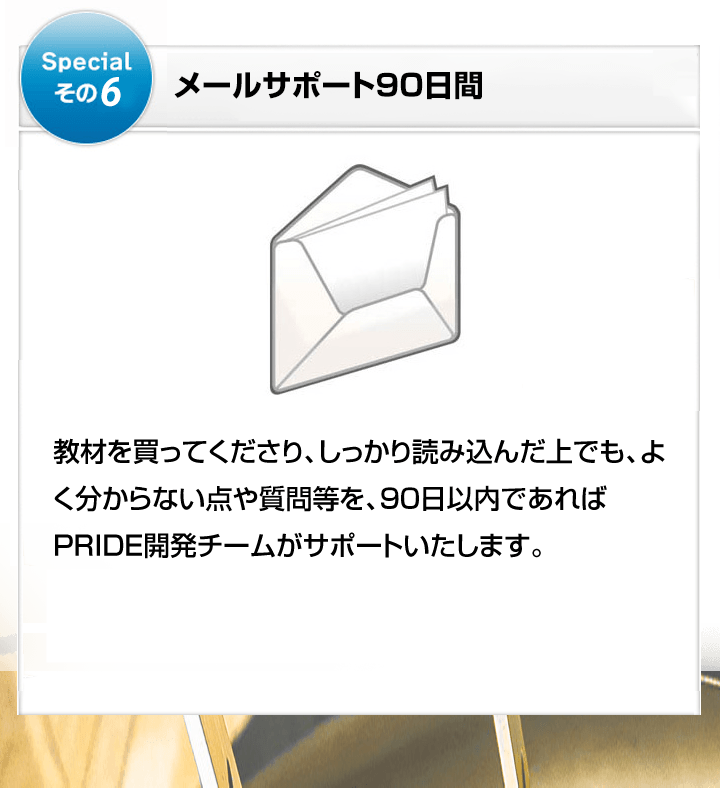 実は約6年前、多くのビジネス系教材を購入しましたが、数ある教材のなかで、PRIDEについては心から自信をもっておススメできます。