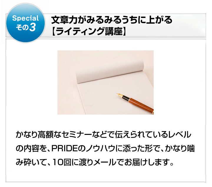 販売ページには書かれていないかも知れませんが、講師の先生方は、人格的にも素晴らしい人たちばかりが集まっており、これがPRIDEの隠れた魅力だと感じています。そのような人たちが心をこめて作ってくださった教材がPRIDEです。