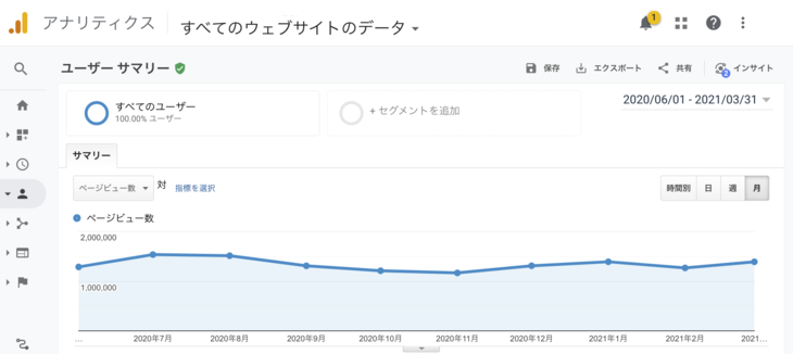 頻繁に記事更新しているときの最高値は 月間250万PV(2020年4月)、その後、記事更新を一旦ストップしましたが、ブログがすでに資産化しているので、月間100万PV以上のアクセスを常に維持しています。